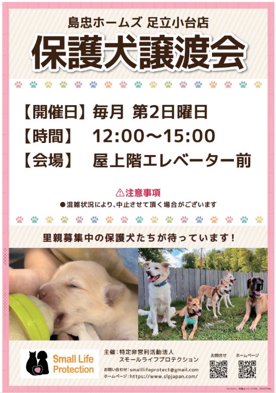 そしてこの度新たに25店舗目として、ホームズ足立小台店において、東京都足立区を中心に活動する「特定非営利活動法人 スモールライフプロテクション」様による譲渡会を、毎月第2日曜日に定期開催いたします。新しいご家族をお探しのお客様は、ぜひこの機会に「保護犬譲渡会」へお越しください。