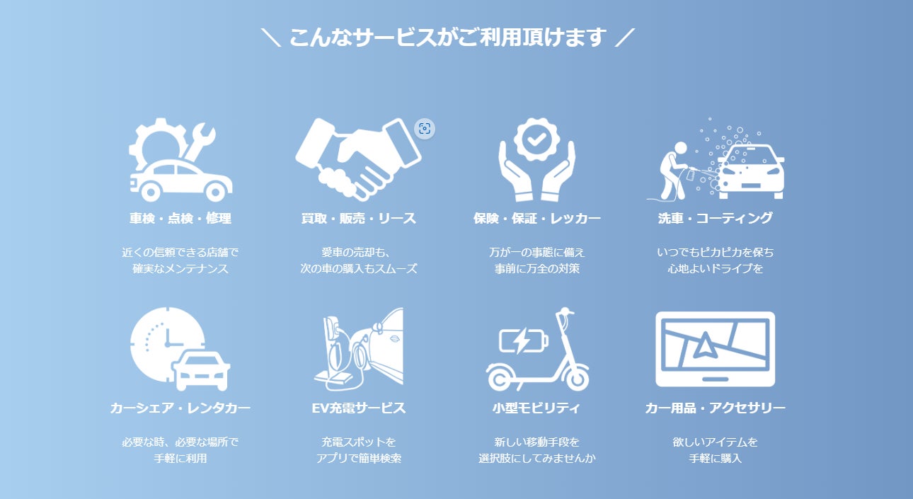 自動車には販売、買取、保険、保証、ロードサービス、メンテナンス、洗車、コーティングなど、さまざまなサービスが存在しますが、サービスごとに提供事業者が分散しており、EVなど多種多様な自動車が販売されている現在、自分が乗っている車種に適切なサービスを提供してくれる事業者をお客様自身で的確に特定することが困難となっています。