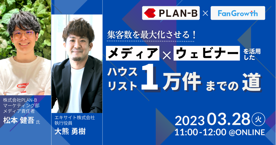エキサイト株式会社(所在地:東京都港区、代表取締役社長:西條 晋一)は、株式会社PLAN-B(所在地:東京都品川区、代表取締役:鳥居本 真徳)と共同で「メディア×ウェビナーを活用したハウスリスト1万件までの道」をテーマに3月28日(火)11:00〜参加費無料のウェビナーを開催します。