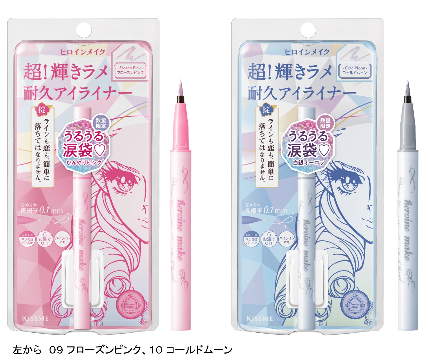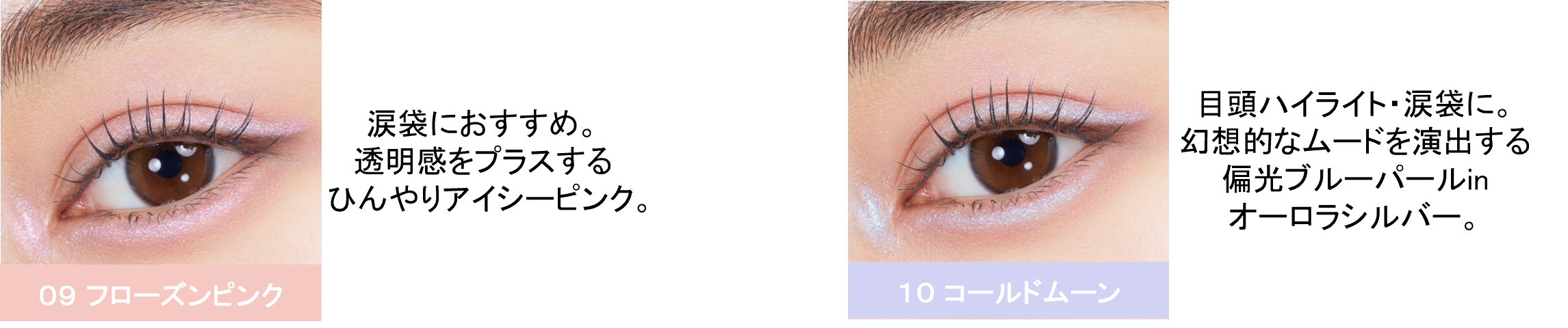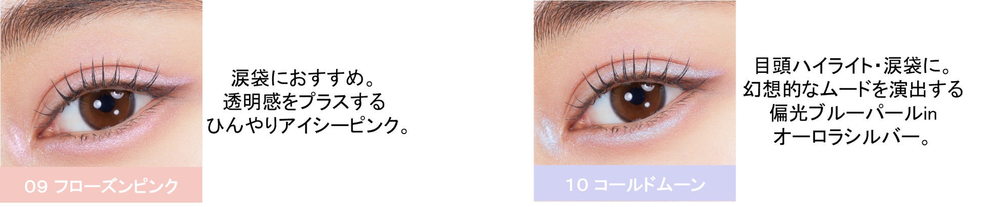 透明感をプラスするひんやりアイシーな「09 フローズンピンク」と、偏光ブルーパール配合で幻想的な輝きの「10 コールドムーン」。