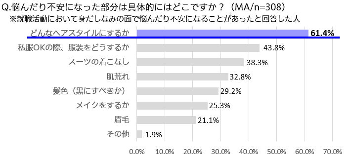 就活生の約6割が身だしなみの面でも悩みや不安を感じたと回答。そのうち「どんなヘアスタイルするか」悩んだり不安になったと回答した人が61.4%となり、2位の服装と大きく差をつけて、髪型悩みが1位となりました。