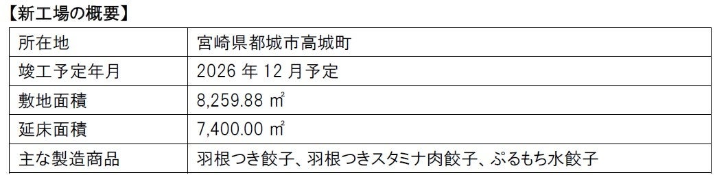 一方、西日本エリアでは、大阪府枚方市にある関西工場にて冷凍食品の生産を行っておりますが、コロナ禍以降続いている需要拡大に対応するため、西日本エリアでの新たな供給拠点として宮崎県都城市に新工場を計画し、弊社主力商品である「大阪王将 羽根つき餃子」、「大阪王将 羽根つきスタミナ肉餃子」、「大阪王将 ぷるもち水餃子」などの生産体制を強化いたします。