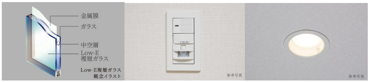 ▲Low-E複層ガラス ▲人感センサー付照明 ▲LED照明
