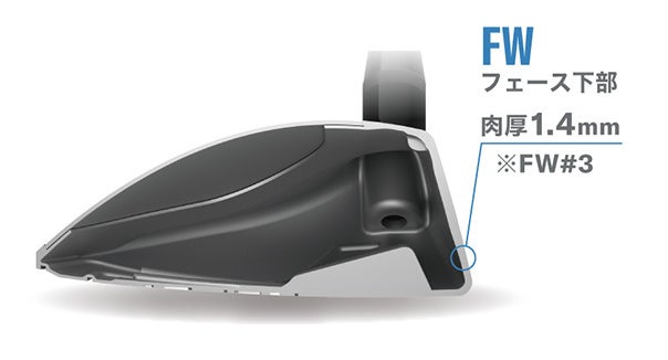 偏肉設計により、実際にボールが当たるフェース下部を薄肉化(フェアウェイウッド:肉厚1.4mm、ユーティリティ:肉厚1.5mm)しました。これにより、打点部分の反発性能が向上し高初速を実現しています。