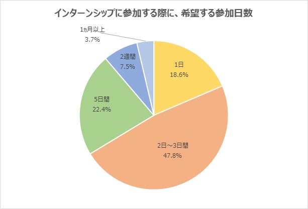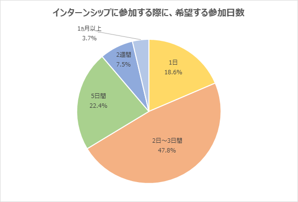学生は複数のインターンシップへの参加を希望する傾向のため、「2日~3日間」や「5日間」が回答を集めたと考えられます。政府は、2025年卒(2024年度卒)の学生から、「5日間以上」で、かつ半分以上を就業体験が占めるインターンシップを対象に、インターンシップでの評価を利用解禁する方向で検討しています。インターンシップと選考が連携されるようになれば、連携の対象となる「5日間以上」のインターンシップに参加を希望する学生の割合はより増えると想定されます。