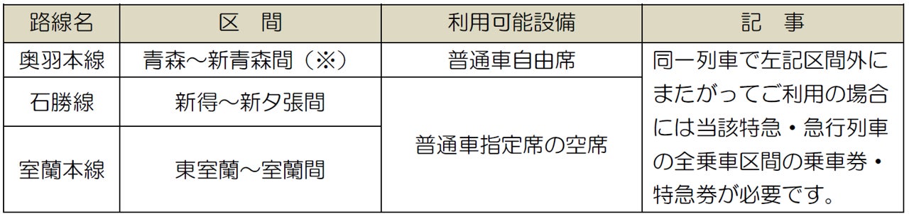 ・別に特定特急券をお買い求めいただくことで、北海道新幹線(新函館北斗~新青森間)の立席(空いている席)がご利用可能。