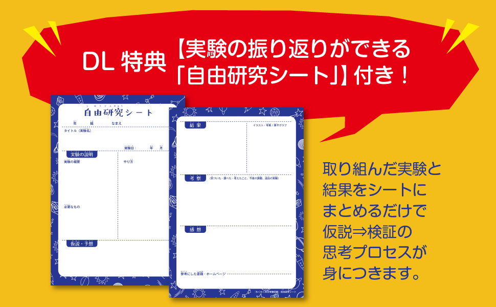 さらに今回は、実験の振り返りができる「自由研究シート」を特典として付けています。仮説・予想を立て、結果、考察も書き込めるシートです。この1枚があれば自由研究対策もバッチリです!