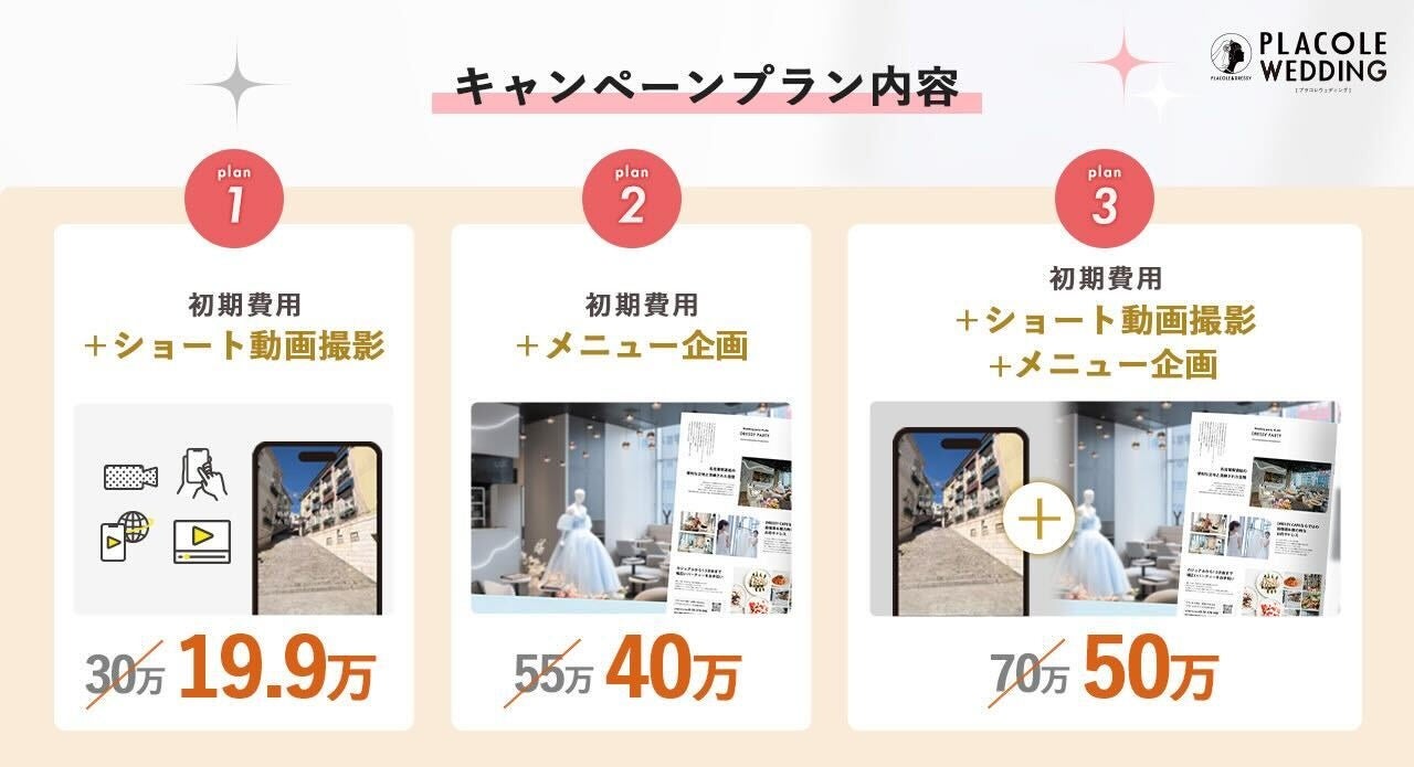 今回、関西エリア初出店決定を記念し、関西エリアの結婚式場・ホテル・フォトスタジオ・レストランウェディング等の事業者さまを対象に、今だけの「豪華3大特典付きオープン記念キャンペーン」を実施いたします。「動画制作を試してみたい」「新メニューで集客を強化したい」など、DRESSY CAFE大阪の出店タイミングに合わせて動き出したい式場様へ向けた、今だけのご提案です。今が一番お得にスタートできるチャンス、ぜひこの機会にプラコレウェディングのサービスをお試しください。