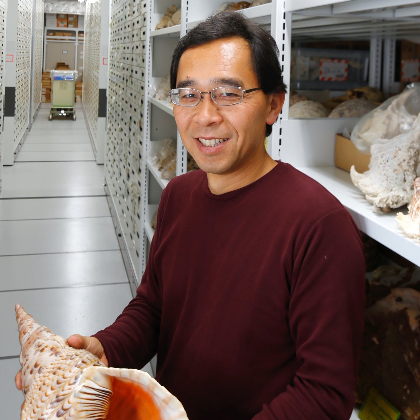 専門分野は腹足類(巻貝)の分類学。物心ついた頃から、貝は私の心の中で大きな存在でした。その魅力を改めて見つめ直そうというのが、今回の企画展の出発点です。研究対象や食材としての魅力はわかりやすいものの、掌の中で貝を愛でる時の幸福感を説明するのはやはり困難です。生物の適応進化の産物が、なぜこれほど心をとらえるのか、その謎は深まるばかりです。