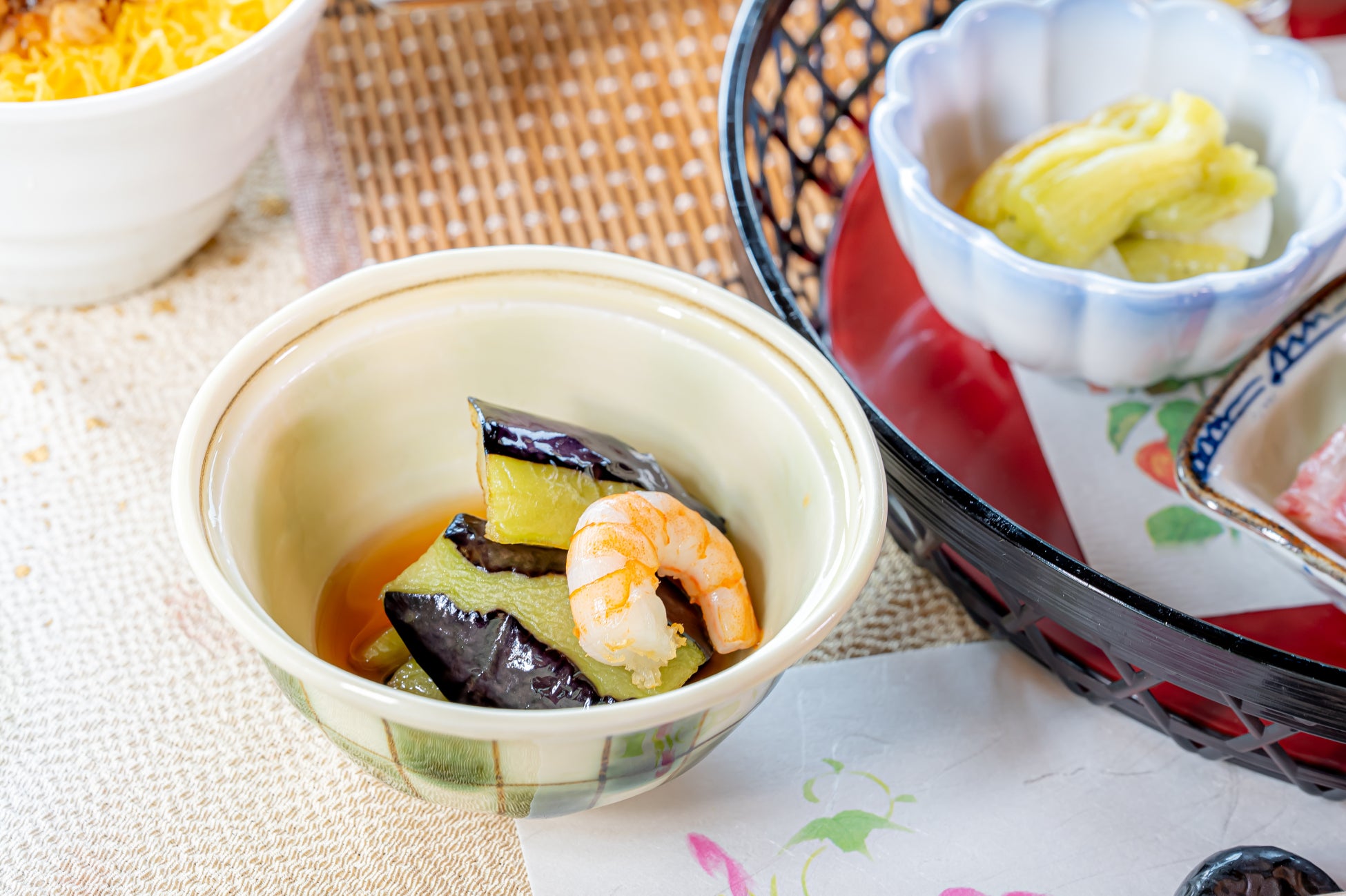 ・鱧ちりと鯛の洗いサラダ仕立て 梅ドレッシング ・焼き茄子と長芋の美味出汁
