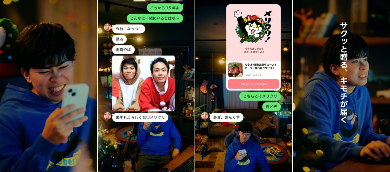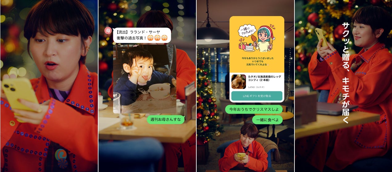 お笑い芸人のサーヤさん(ラランド)と動画クリエイターのマサイさん(フィッシャーズ)を起用した、「LINEギフト」のクリスマスWEBCMを公開しました。サーヤさんは離れて暮らすお母さんと、マサイさんはフィッシャーズのリーダー・シルクさんと、LINEのメッセージを通して過去のクリスマスを振り返り、LINEギフトでプレゼントを贈り合う模様を収めた縦型ショートムービーです。LINEのトーク画面で繰り広げられるコミカルなやりとりを、リアルにスマホ視聴画面に落とし込んだ親近感のある縦型ならではの演出や、2人の実際の秘蔵写真や懐かしの動画の登場も見どころです。