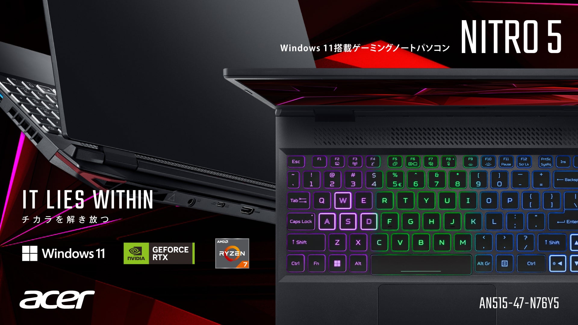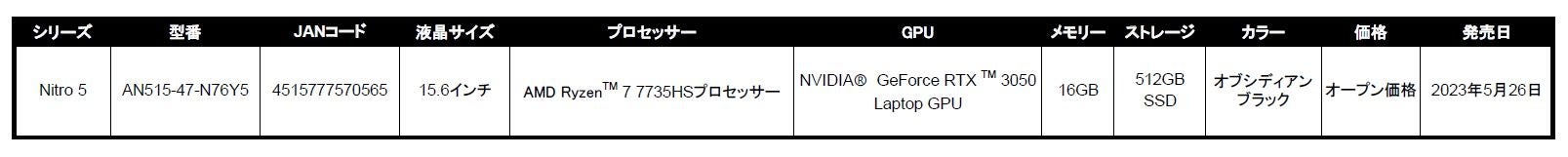 日本エイサー株式会社(本社:東京都新宿区、代表取締役社長:ボブ・セン)は、カジュアルゲーマーからコアゲーマーまで幅広いゲーマーに向けたゲーミングブランドNitro (ニトロ)より、ゲーミングノートパソコン Nitro 5の新モデル「AN515-47-N76Y5」を2023年5月26日(金)に発売します。CPUはパワフルなパフォーマンスをサポートするAMD RyzenTM 7 7735HSプロセッサー、グラフィックスはNVIDIA(R) GeForce RTXTM 3050 Laptop GPUを搭載。パフォーマンスにはこだわりつつ、気軽にゲームを楽しみたいカジュアルゲーマーの方におすすめのゲーミングノートパソコンです。