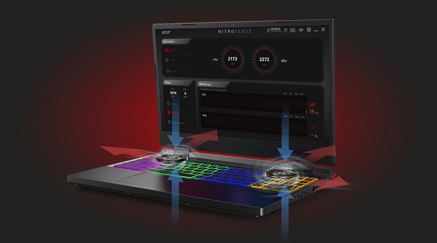 さらに、熱によるパフォーマンス低下を防ぐための冷却ファンを2基搭載。4つの排気口から効率的に熱を排出します。加えて、独自機能のシステム設定アプリNitroSenseにより、静音モードやパフォーマンスモードなどのモードの変更、CPUやGPUの発熱量のモニタリング、ファンの速度調整、4つのゾーンごとのキーボードのバックライト色の設定、サウンド設定など様々な設定変更や管理が可能です。また、キーボード上にNitroSenseキーを配置しているので、スムーズにNitroSenseアプリにアクセスすることができます。