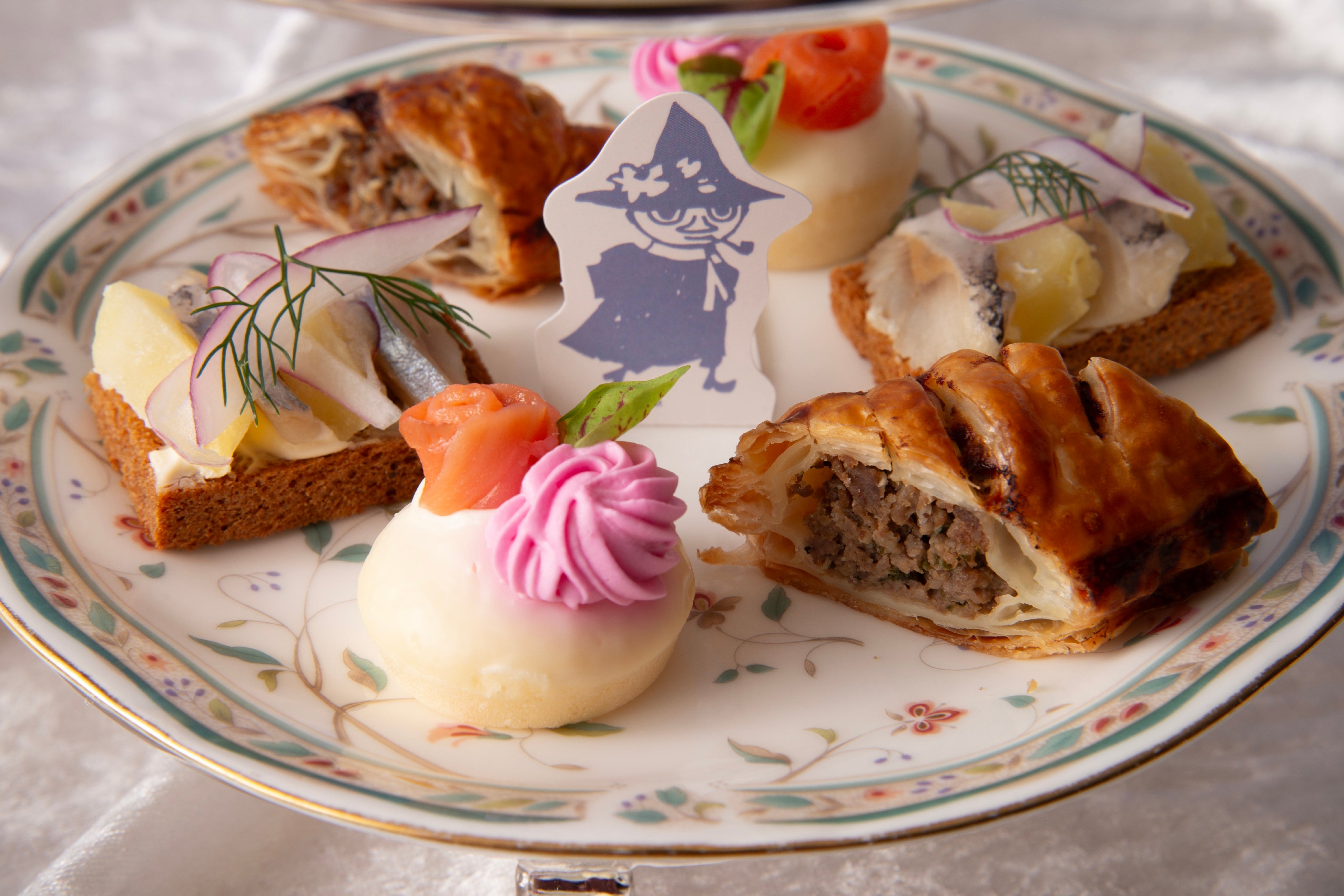 冬の静寂の中に、春の芽吹きをそっと感じさせるよう仕立てた下段のセイボリー。フィンランドの伝統料理をアレンジした「リハピーラッカ風ミートパイ」、ビーツのクリームとサーモンの旨みを合わせた「パンケーキとスモークサーモン」、ライ麦パンとマリネしたニシンを使った「ニシンのスモーブロ」など北欧らしい味わいを3種揃え、そのそばには長い旅を終え、春とともにムーミン谷に戻るスナフキンの姿も。静かな冬の終わりに、再会のよろこびとあたたかさを添えています。