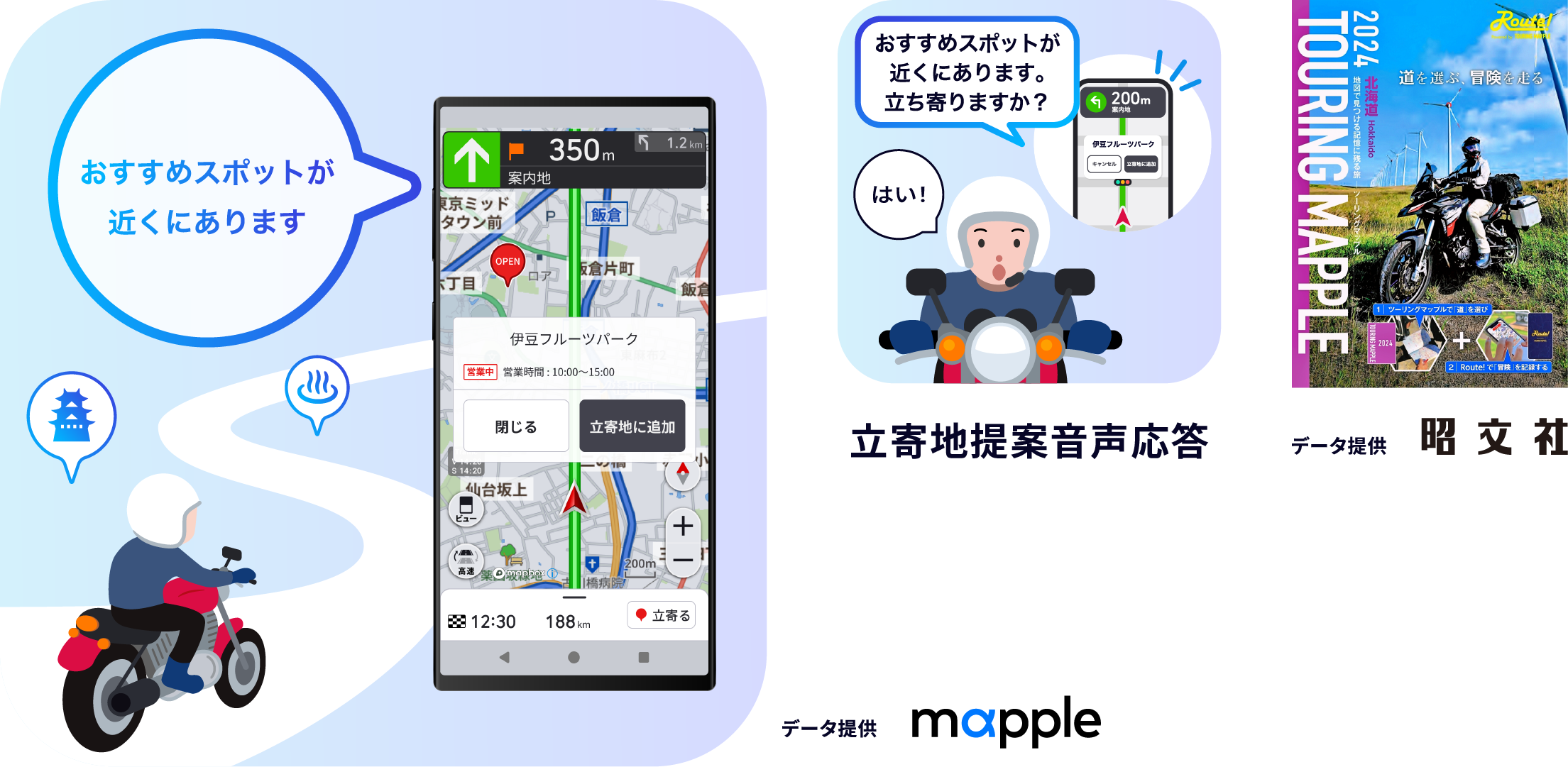 β版に搭載していた“おすすめスポットルート情報”をさらに拡充。株式会社マップルが提供する「マップル観光ガイドデータシリーズ」の情報を活用し、さらに多くの観光スポット情報や、施設の位置・営業時間を表示するようになりました。また、立寄り地提案時の発話応答(はい/いいえ)にも対応。さらに、バイクツーリング向け地図の定番「ツーリングマップル 2024年度版(株式会社 昭文社発行)」に掲載されているツーリングスポットの情報も加わります(4月末予定)。