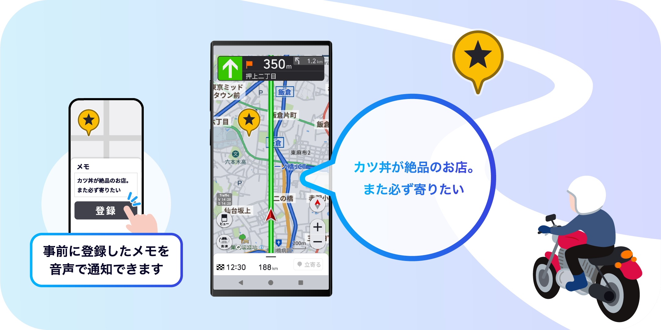 お気に入りの店や行ってみたい場所をメモとして登録し、ツーリング中に登録地点に近づいた際、音声で通知できるようになりました。