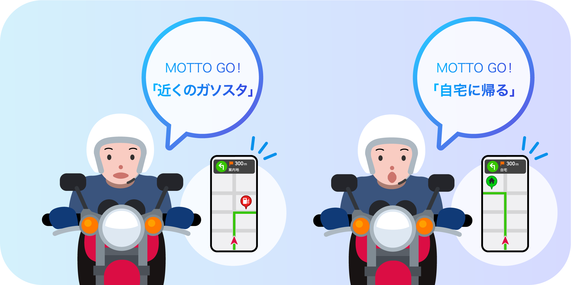 「MOTTO GO、自宅に帰る」(「ルートをキャンセル」「近くのコンビニ」「近くのガソスタ(ガソリンスタンド)」)などの音声コマンドで、簡単なナビ操作が可能になりました。スマホ画面を操作する必要がないため、安全なツーリングを実現します。