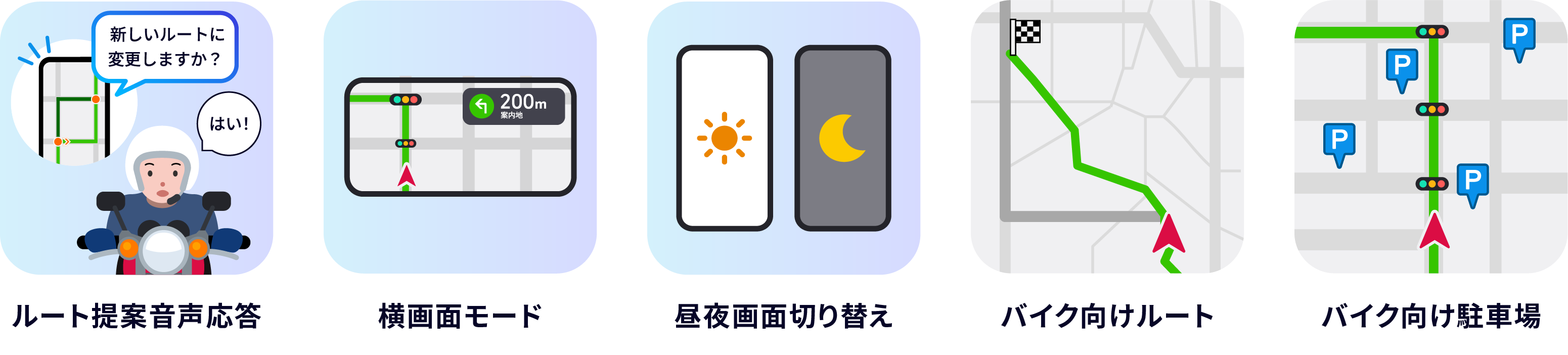 これまでの排気量区分別のルート検索や信号数のカウント案内など、ライダー向けにわかりやすいナビ案内機能をさらに強化しました。リルート提案時の発話応答(はい/いいえ)や、横画面・昼夜画面の切り替えに対応したほか、走りやすい直線道路や交通量が少ない道路を考慮したルート検索、案内を追加。バイク用駐車場の検索機能も搭載しました。