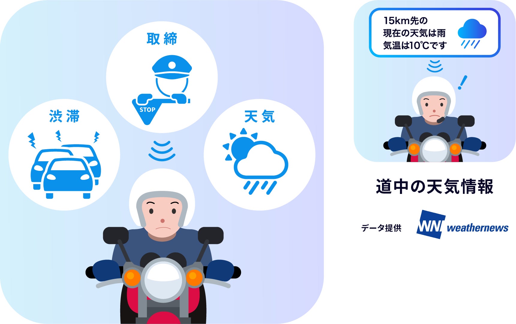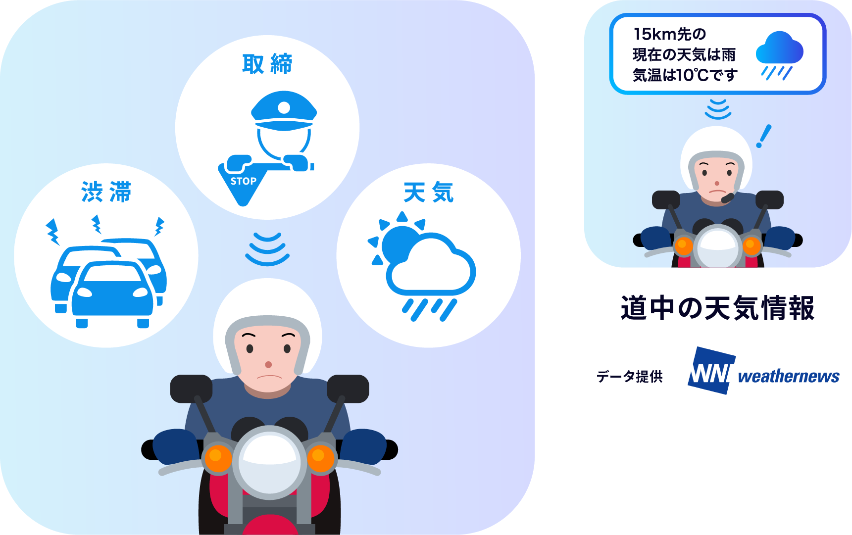 β版で提供していた走行中の渋滞・取締地点情報や急カーブ・未舗装路などの注意ポイント、目的地の天気情報に加え、道中(約15㎞先)の天気や強風注意情報の音声通知を追加しました。