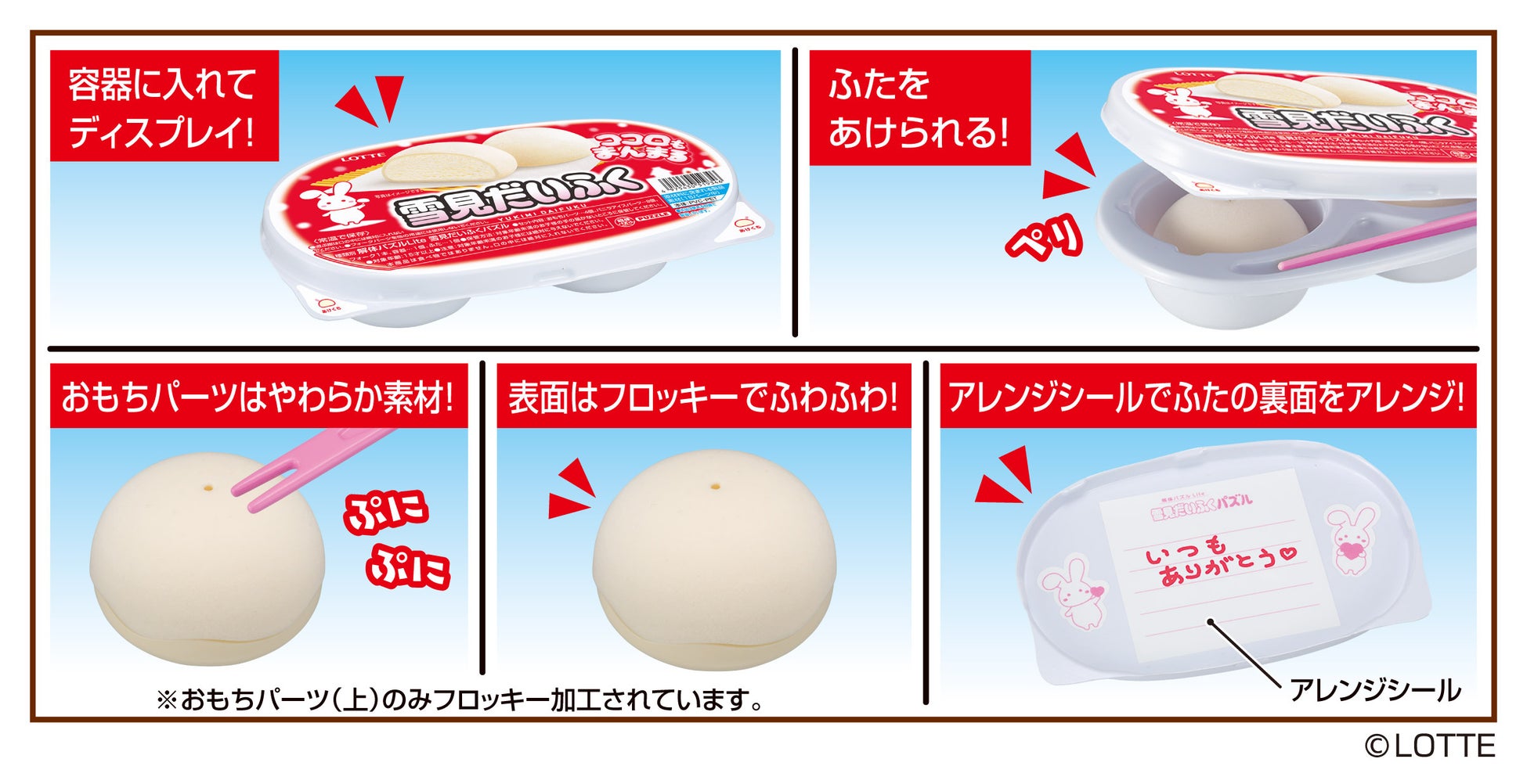 容器は、本物の商品を再現しており、ふたを開閉することができます。ふたのシールは2025年7月にリニューアルされた「雪見だいふく」の新パッケージデザインを一部採用しています。