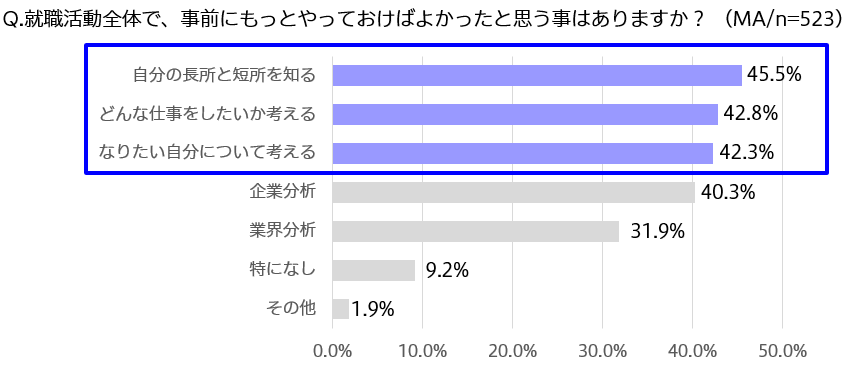 就職活動全体で、事前にもっとやっておけばよかったと思う事はありますか?と聞いたところ、自己分析関連が多くあがりました。これまでも自分の長所や短所、どんな仕事をしたいかを考えるのは自己分析の定番でしたが、「なりたい自分(未来の自分像)についてもっと考えておけば良かった」が42.3%で3位となっており、現代の就職活動においては、自分が何をしたいか、と同時に「どうありたいか」が重要なポイントと言えそうです。