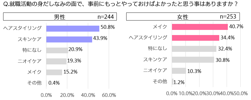 身だしなみで事前にやっておけばよかったことは、男性が1位ヘアスタイリング、2位スキンケア、女性は1位メイク、2位ヘアスタイリングとなりました。男女ともにヘアスタイリングが上位に上がっていましたが、男性の方が全体的に回答数が多く、男性の方が身だしなみ面での不安や後悔が多かったことがうかがえました。