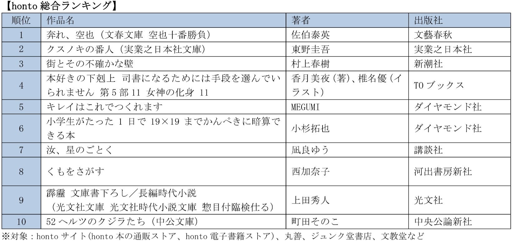 hontoランキングは、honto サイトと、honto サービス実施店の丸善、ジュンク堂書店、文教堂などで購入された書籍や電子書籍の販売データをもとに集計しています。