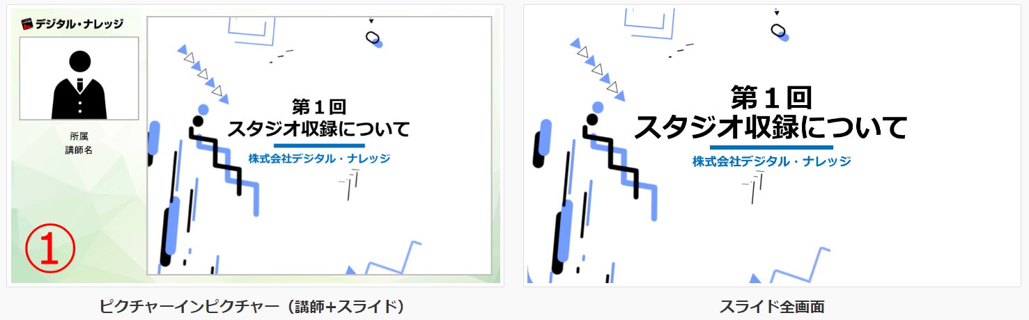 『ピクチャーインピクチャー(講師+スライド)』形式または『スライド+音声』のどちらかをお選びいただけます。また、ご提供いただけましたらロゴを掲示することも可能です。