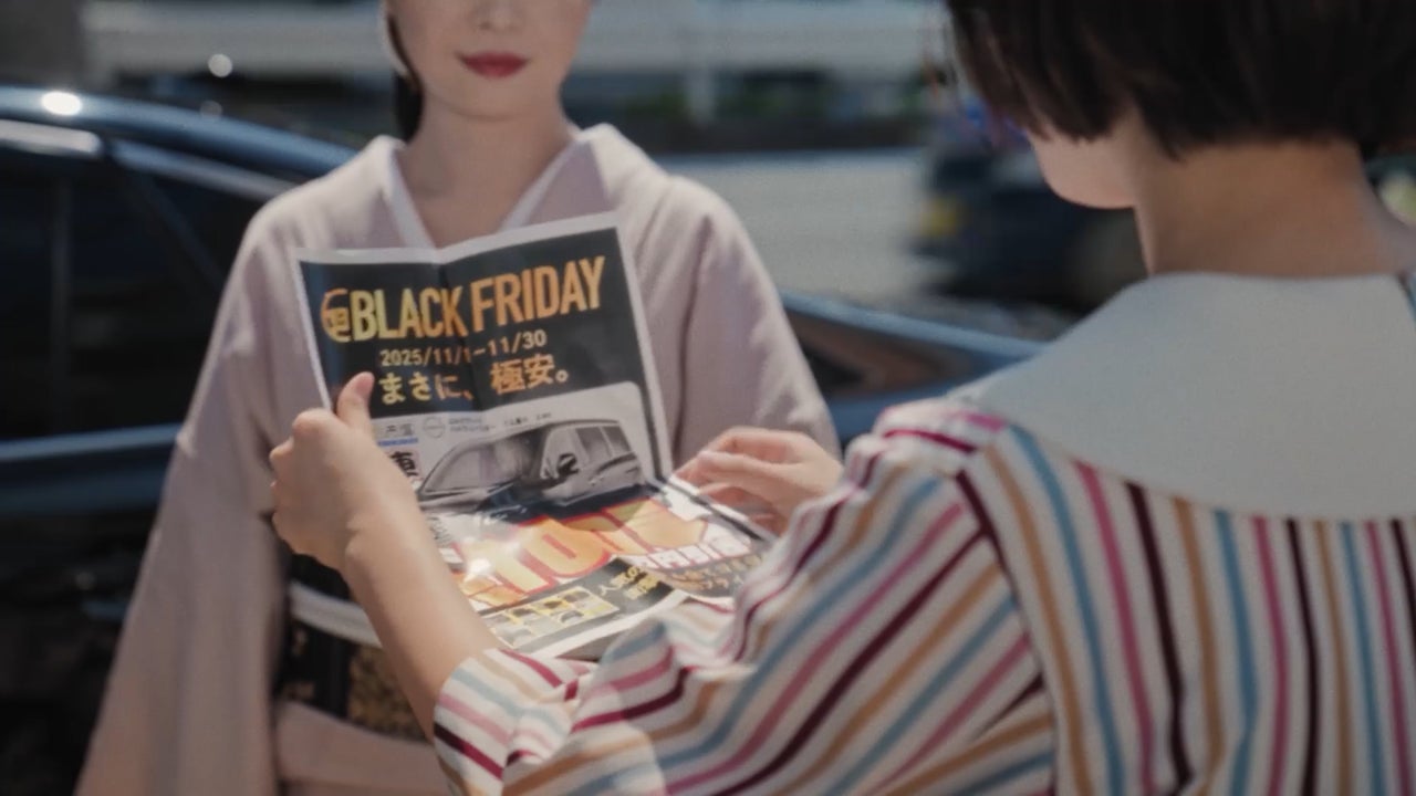 黒塗りの車から颯爽と降り立つ環。「こんな立派な車、粟津って人の危ない金とちゃうん?」と、驚いた真琴が問いただすと、環は「あほんだら!」と一喝し、一枚の紙を差し出す。「新車市場はディーラーで買うより安いんや。これでわての道を進むんや」と告げる環に「まさか…極道?」と問いかける真琴…。環は「あほんだら、国道や」と言い捨てる。「全メーカーの新車を選べる」「お客様に合わせた支払い方法」「アフターメンテナンスまで提供」という、これまでにない新車販売店の姿を、任侠映画の緊張感に重ねて描く。