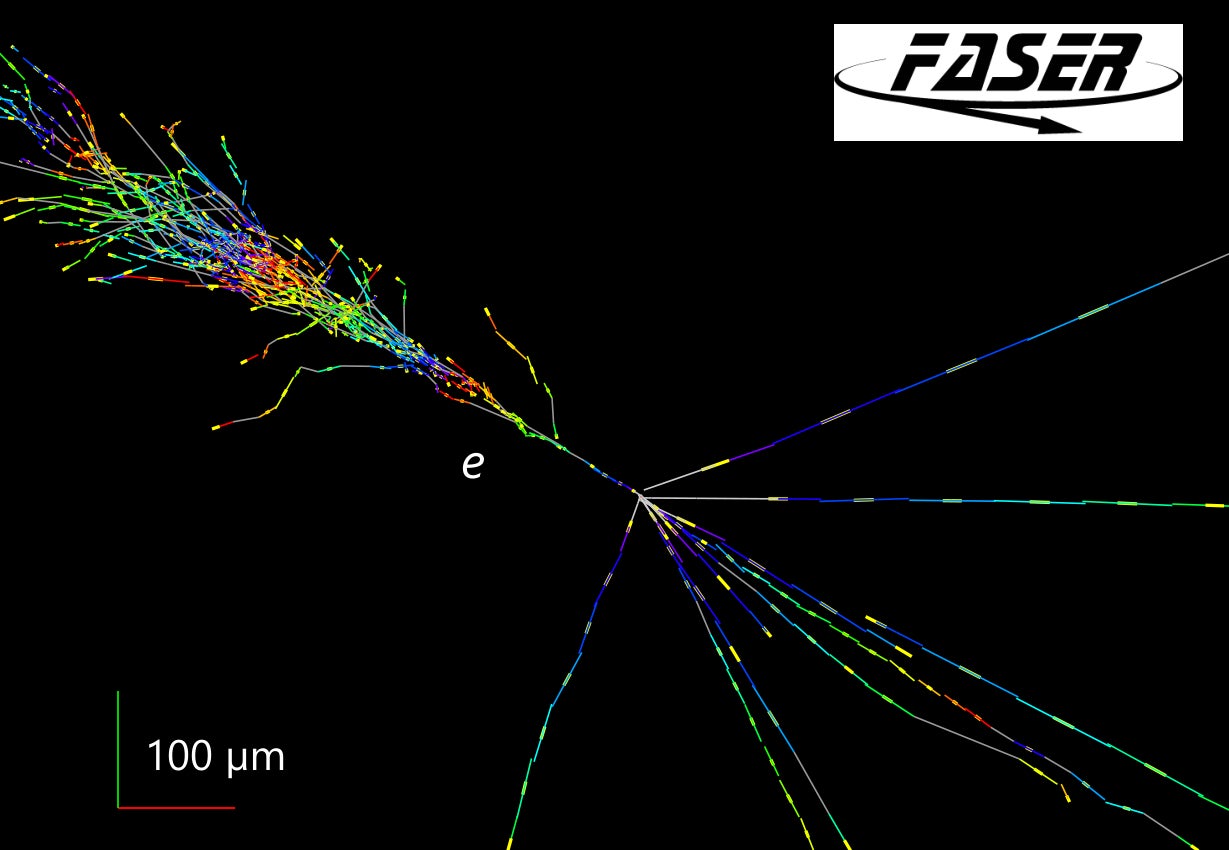 本研究では大量の背景事象の中から高いエネルギーの事象を選び出すことにより、電子ニュートリノとミューニュートリノの検出に成功しました。電子ニュートリノに関してはLHC実験の中で今回が初めての観測です。電子は物質と相互作用すると電磁シャワーを起こすことが知られており、その様子が検出器中で美しく観測されています(図4)。