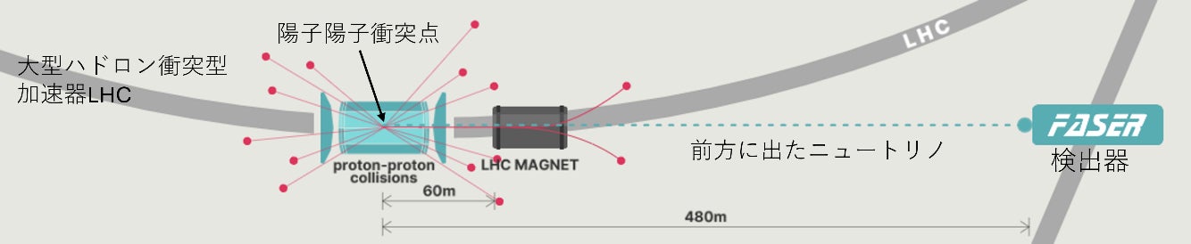 注1) FASER国際共同実験:ダークマター(注6)の正体解明に繋がる未知粒子を探索することと高エネルギーニュートリノ研究を目的とし、CERN の大型ハドロン衝突型加速器LHC(注2)の陽子衝突点の超前方(ビーム軸に対して 0.03°程度)の 480m 地点に検出器を設置して行う実験。FASER実験のニュートリノプログラムは有賀昭貴准教授と有賀智子准教授らが提案し、国際研究グループを牽引してきた。