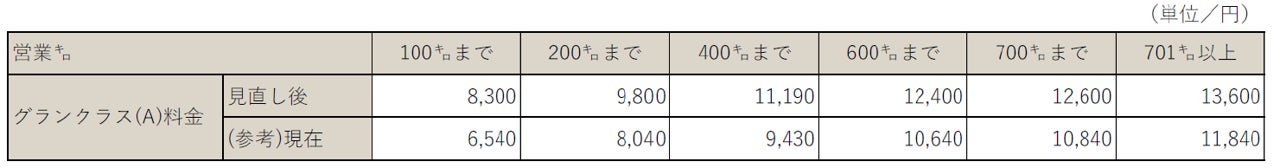 「グランクラス(飲料・軽食なし)」については、現行料金からの変更はありません。