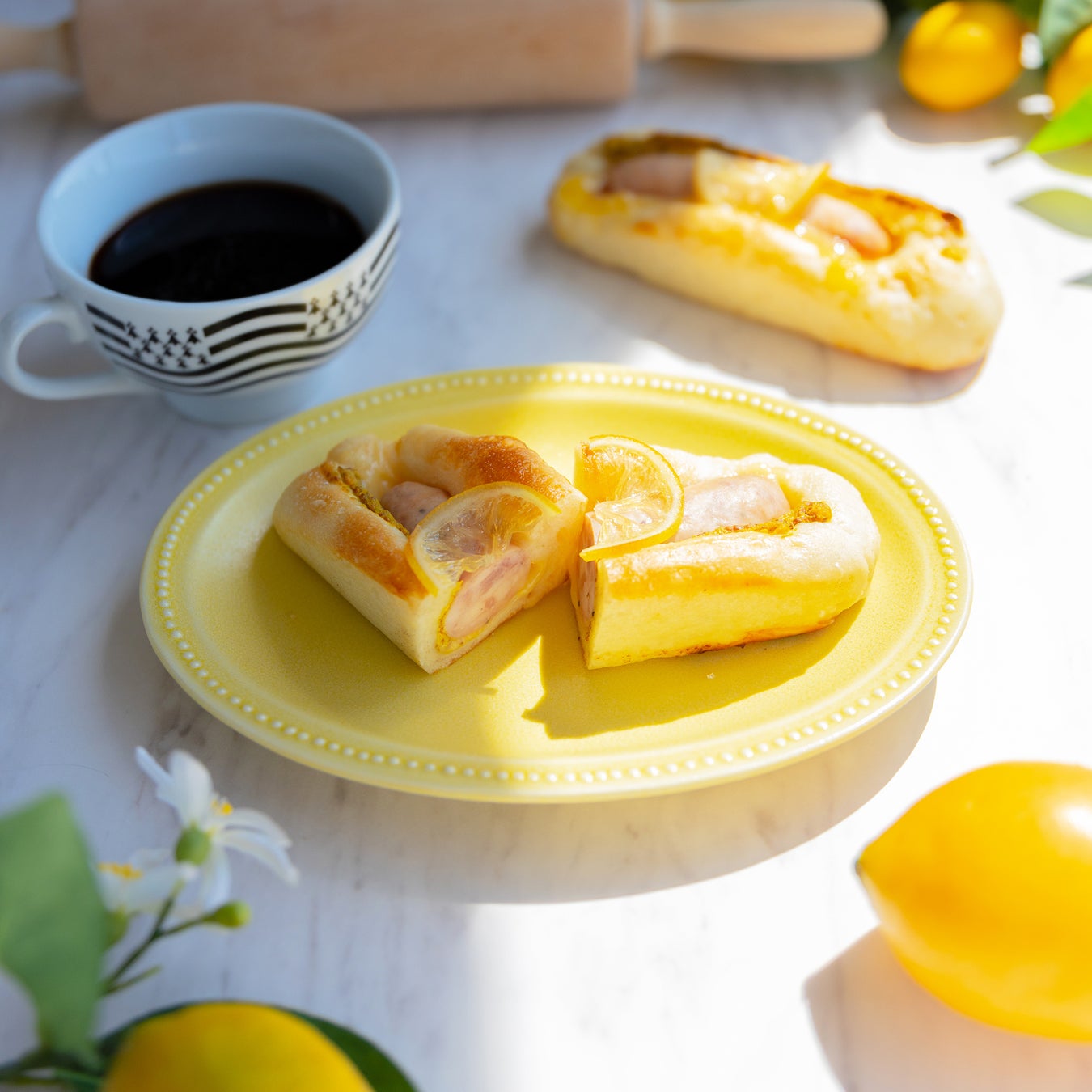 フランスパン生地で瀬戸内レモンのペーストとジューシーな極太のソーセージをサンドし、レモンをトッピング。