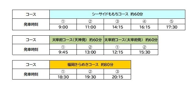 ※上記日程より、「シーサイドももちコース」「福岡きらめきコース」「太宰府コース」の3コースで運行し、全コースにおいて運行時刻を変更いたします。