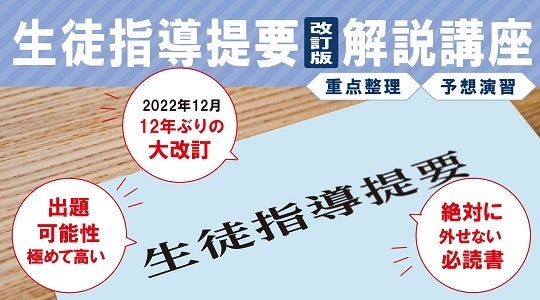 これまでの出題傾向からすると、今年以降の教員採用試験での出題可能性は極めて高いです。当講座では、今回の改訂の趣旨やポイントを背景からわかりやすく解説したうえで、筆記試験に向けてのキーワード整理と人物試験への内容の落とし込みを行います。