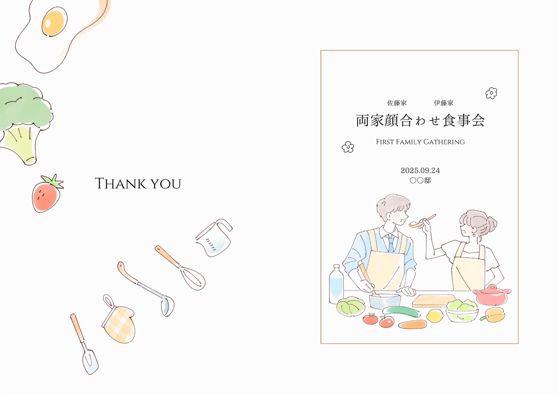 キッチンで仲良く料理をする二人の姿を描いた、温かみのあるデザイン。「これからの夫婦生活も、ふたりで支え合いながら、愛情いっぱいの毎日を過ごせますように。」そんな願いを込めました。