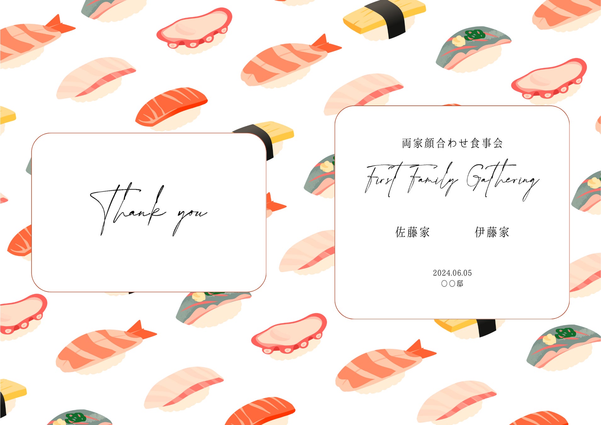 おめでたい席に欠かせない「寿司」のデザイン。カラフルなお寿司の模様が楽しげです。お寿司好きなお二人に。