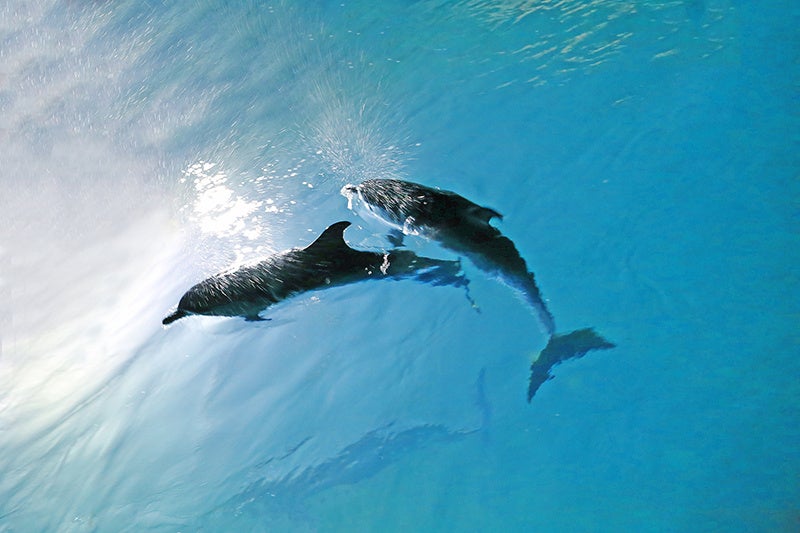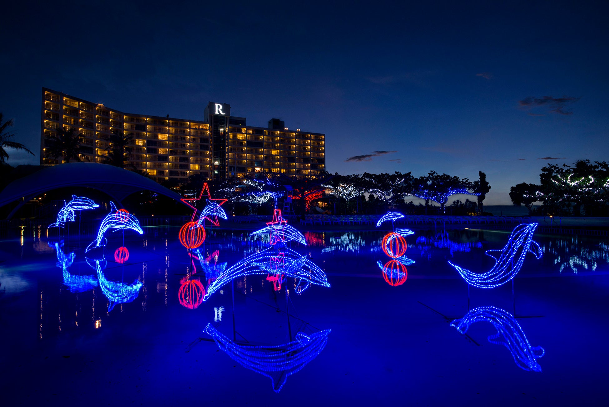 アウトドアプールにはブルードルフィン13頭のファンタジックなイルミネーション。