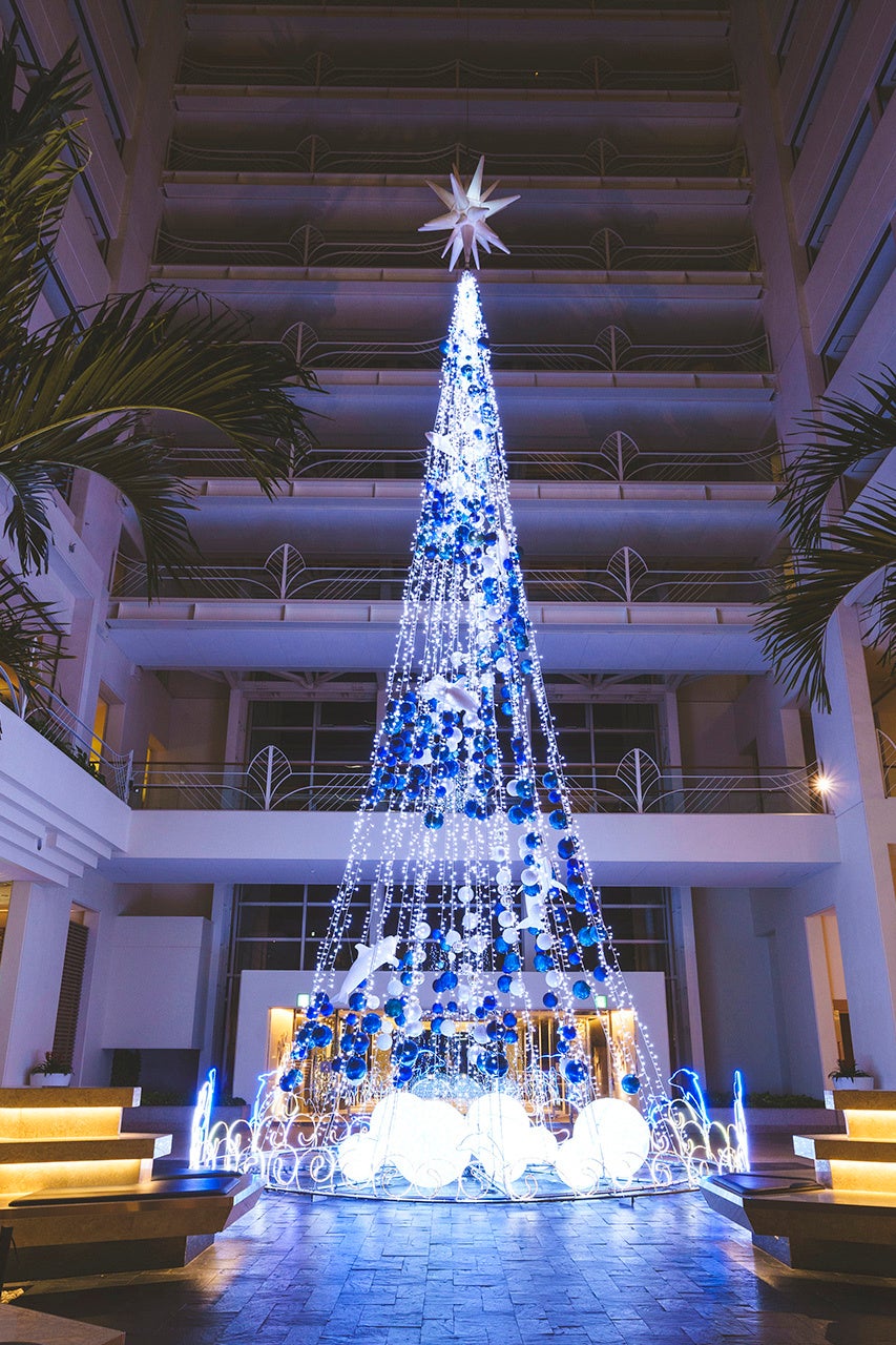 ロビーでは高さ13mのクリスマスツリーがお迎え。海中の泡をイメージしたボールオーナメントとともにイルカが泳ぐLEDライトのクリスマスツリーの後ろには、お菓子がいっぱいのファンタジックなキャンディハウスがお子様をお待ちしています。