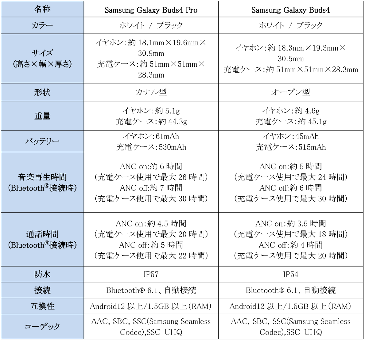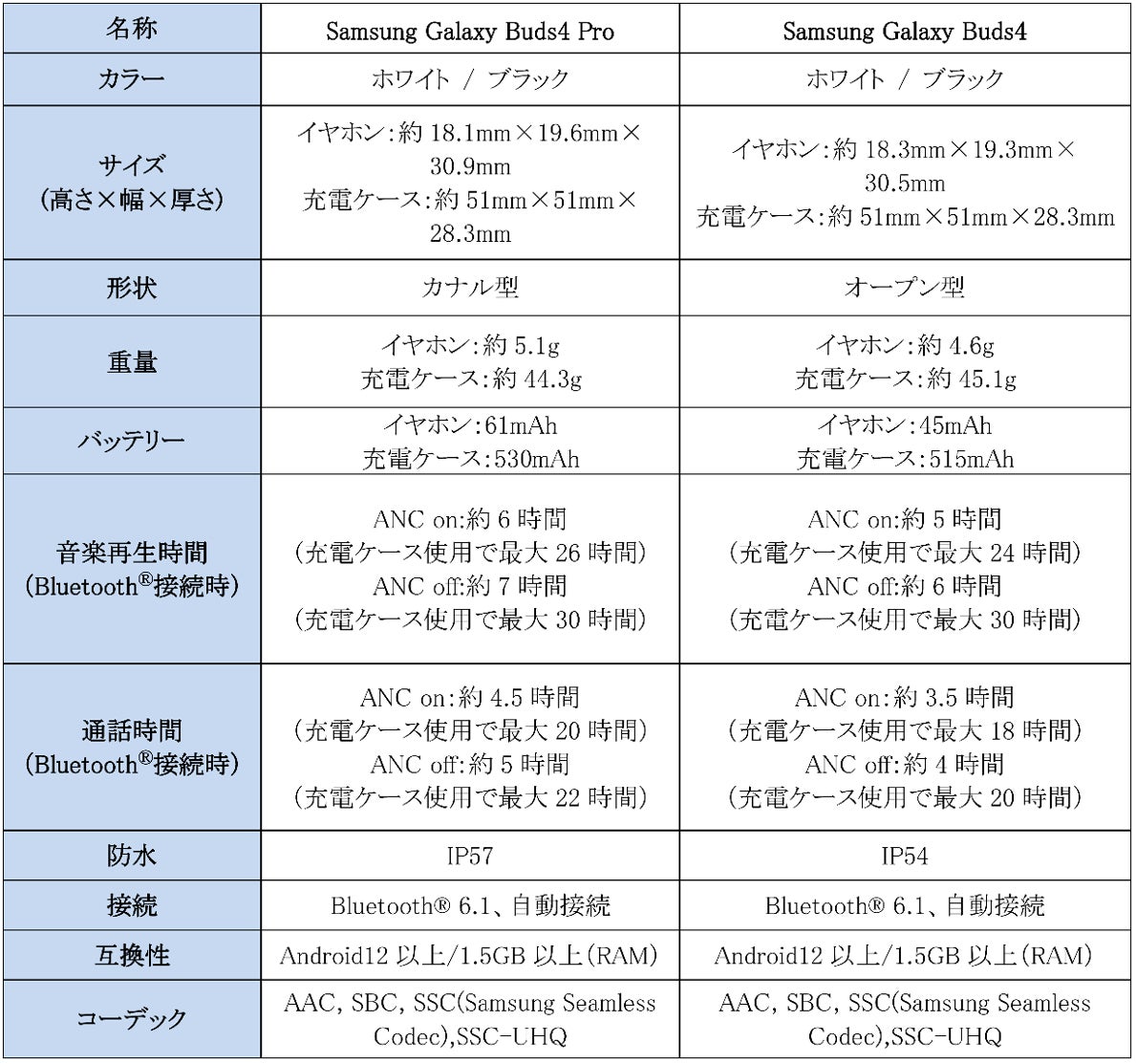 <主な仕様 : 「Samsung Galaxy Buds4 Pro」「Samsung Galaxy Buds4」>
