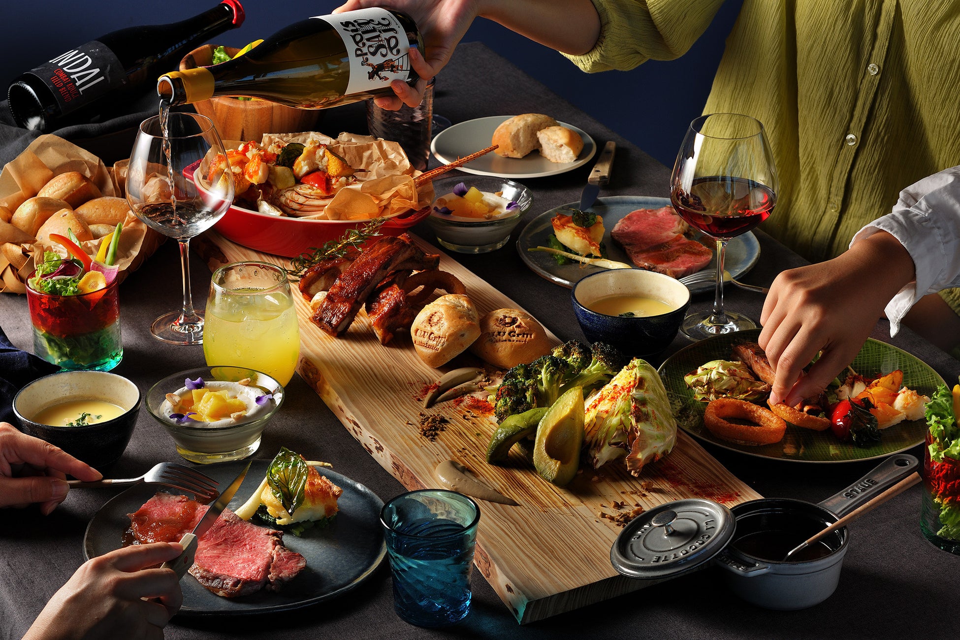 イベント期間限定で2つのグルメが登場します。夜のバンタカフェでは「夜のピクニックセット」を販売。バスケットに⼊れて提供するメニューは沖縄のソウルフード「ポークたまごおにぎり」です。ローストビーフや⼤ぶりの海⽼をサンドすることで贅沢にアレンジしました。購⼊者はランタンとビーチマットの貸し出しを利⽤することができ、白砂のビーチや高台のテラスなど好きな場所で夜のピクニックが楽しめます。また、バンタカフェ併設のグリルレストラン「星野リゾート オールーグリル 」では、特別メニュー「うまんちゅグリルディナー」を提供。「うまんちゅ」は沖縄の言葉で「みんな 」という意味です。家族や仲間たちが集まるシーズンにピッタリのメニューは、⻑さ1mもある大きなプレートにスペアリブやシーフードなど自慢のグリル料理を盛り込みました。壁一面の窓から、瞬く星と輝く海を眺めながらディナータイムを満喫します。