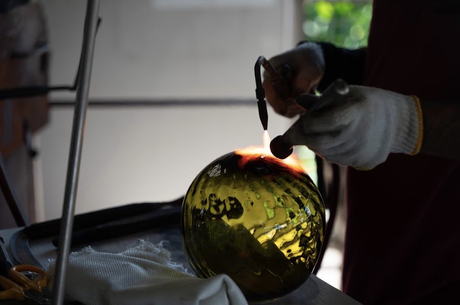 資源が限られる離島の沖縄は、古くから物を⼤切にし資源をリサイクルする考えが息づいています。本イベントにあわせて再⽣ガラスを原料とした「琉球ガラス」を作るガラス⼯房の協⼒を得て、空瓶となったソーダの瓶を使いオリジナルのランタンを作りました。ランタンは漁具として使われている「浮き球」をモチーフにしています。400本以上の空瓶をアップサイクルした⼤⼩50個の「浮き球ランタン」が⽩砂のビーチを照らします。
