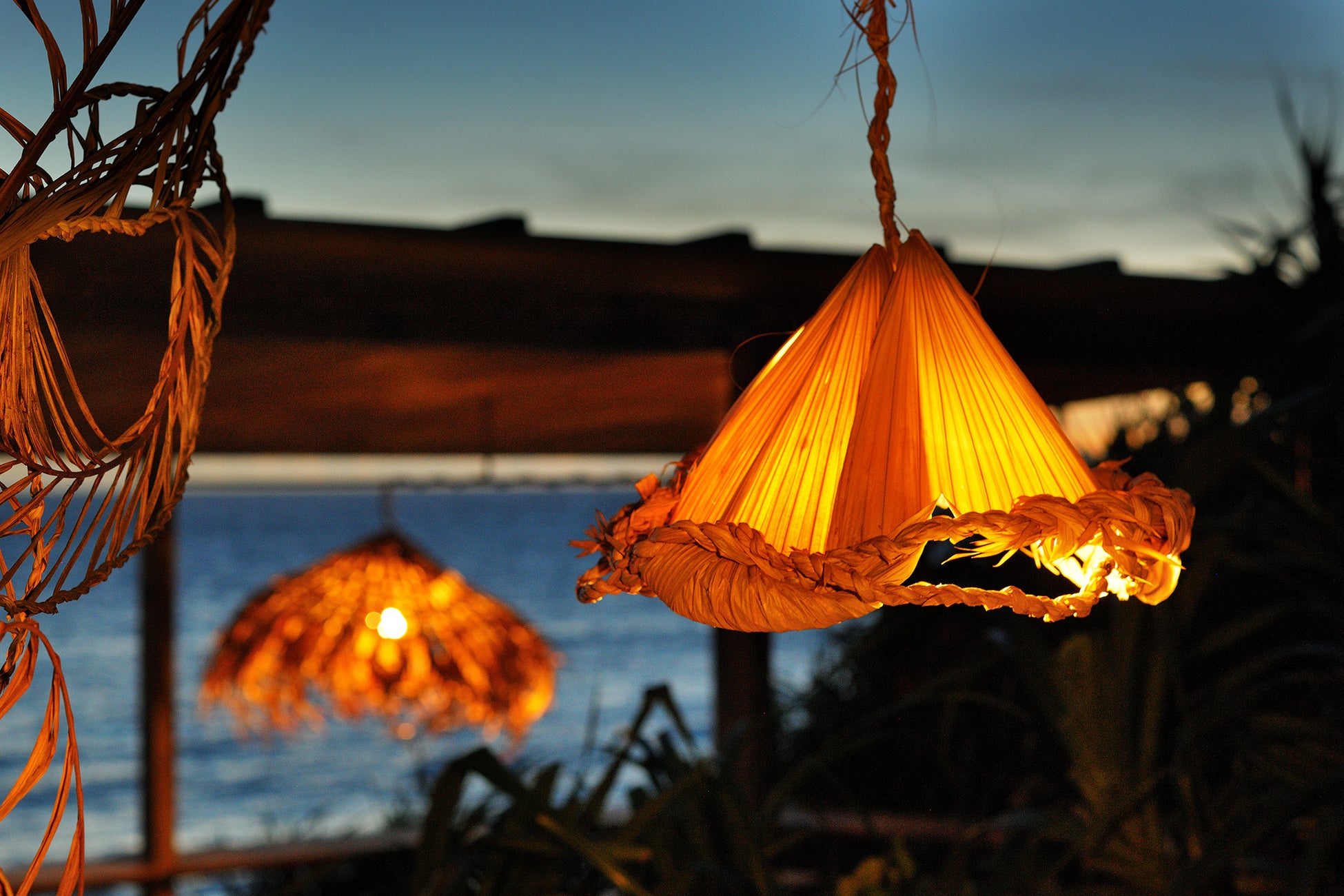 崖の上から浜辺へと続く散策路に東屋が点在する「海辺のテラス」では、沖縄の伝統的な草編みの民具をアレンジした「マーニとクバのランプシェード」が優しく灯ります。沖縄で「マーニ」と呼ばれる長い葉のヤシを丁寧に編み込んで、葉と葉の隙間から零れる光と影を楽しみます。また、クバの葉でつくる沖縄伝統の民具は穏やかな灯りで辺りを照らします。作り手のぬくもりを感じる温かな灯りに癒されながら、輝く海を眺めます。