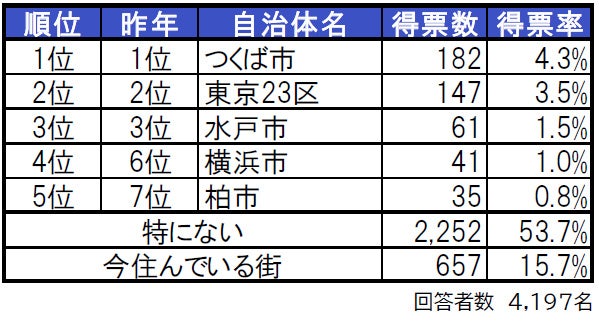 研究学園都市として発展し続け、今なお人口が増加しているつくば市は、商業施設の充実度や交通利便性の高さから今年も高い得票率で1位です。トップ5のうち3つは、茨城県外の自治体(東京23区・横浜市・柏市)となっています。