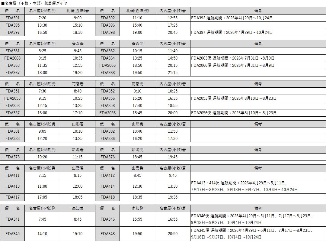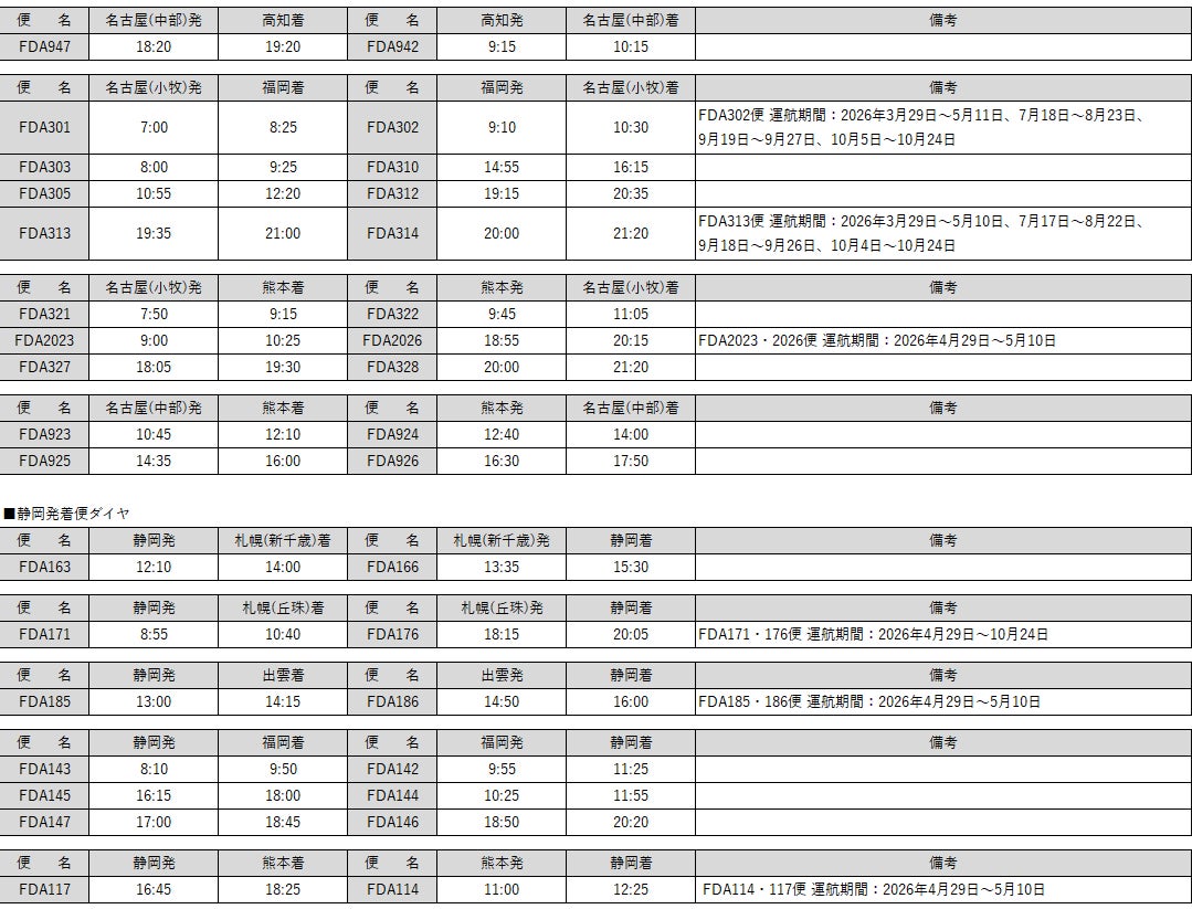 株式会社フジドリームエアラインズ(略称:FDA、本社:静岡県静岡市、代表取締役社長:本田 俊介)は、2026年夏ダイヤ[2026年3月29日(日)~2026年10月24日(土)]ならびに運賃を決定いたしました。