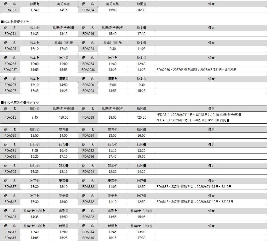 ※6 FDA302便:2026年3月29日~5月11日、7月18日~8月23日、9月19日~9月27日、