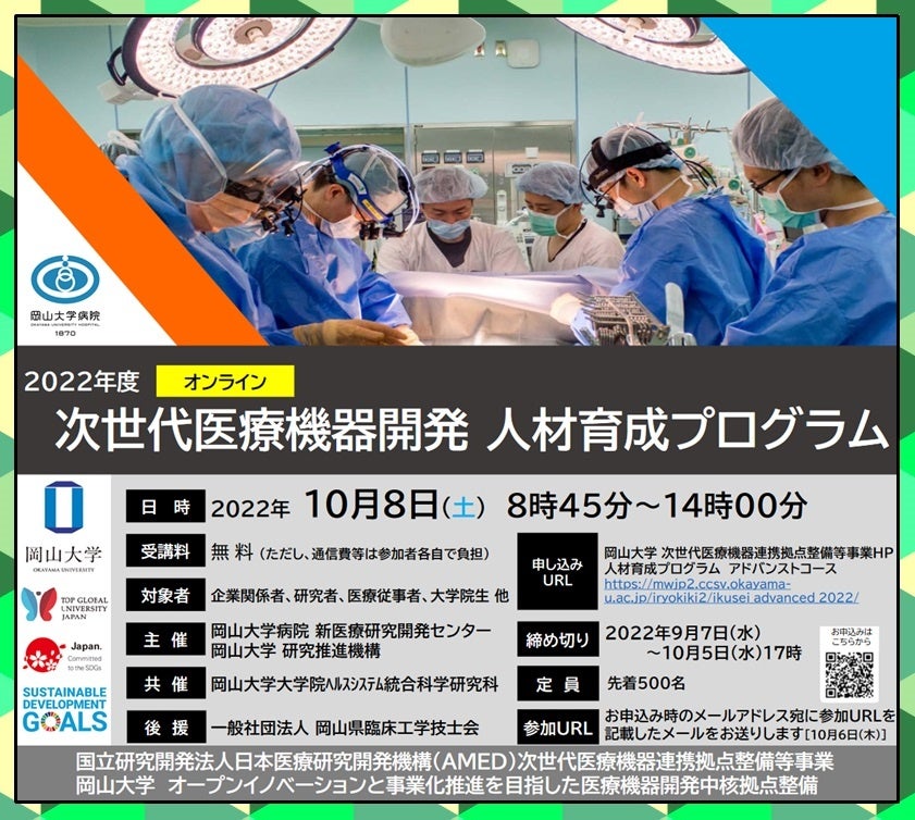 国立大学法人岡山大学(本部:岡山市北区、学長:槇野博史)の岡山大学病院では、医療機器開発等に関心のある方を対象とした参加費無料の人材育成プログラム「2022年度次世代医療機器開発人材育成プログラム アドバンストコース」を、2022年10月8日(土)にオンラインで開催いたします。