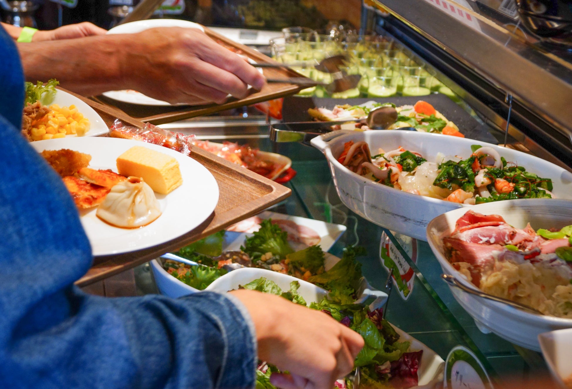 ホテルヴィスキオ尼崎2階にある気軽に楽しむ カフェ & レストラン朝は食材にこだわった和洋バイキング、昼は「ご飯に合う」洋食ランチと色とりどりのスイーツ、