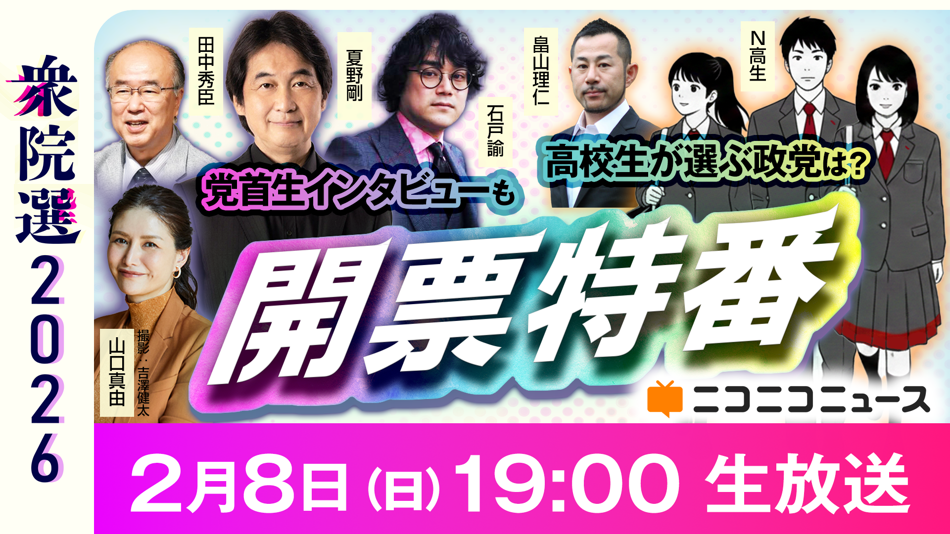 株式会社ドワンゴ(本社:東京都中央区、代表取締役社長:夏野剛)は、2月8日(日)19時00分より、ライブ配信サービス「ニコニコ生放送」にて、第51回衆議院議員選挙の特別企画として「【衆院選2026】開票特番」を生配信します。開票前の19時からは若い世代に向けた企画を展開し、20時以降は開票速報と各党の動きを伝えます。