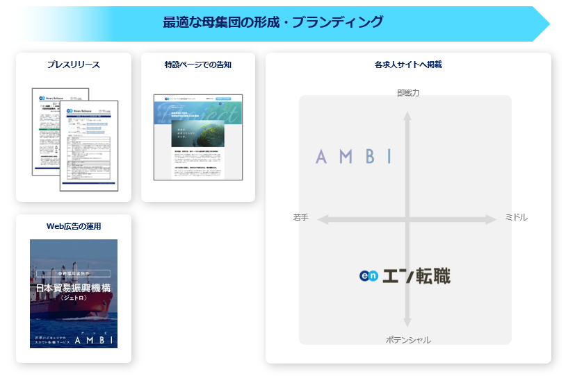 プレスリリースや特設ページ、Web広告での告知に加え、各求人サイトでの集客サポートを実施いたします。『エン転職』『AMBI』とターゲットの異なる求人サイトを活用することで、ターゲットへ網羅的に求人を届けます。